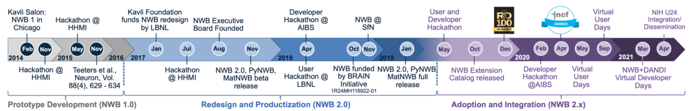 Building on the success of NWB 1.0, the project entered a second phase, with additional leadership by Dr. Kris Bouchard, Dr. Oliver Rübel (Lawrence Berkeley National Laboratory, LBNL), Dr. Loren Frank (UCSF) and Dr. Edward Chang (UCSF). One main goal was to develop the next version of NWB and to enhance its adoption, through development of an advanced software architecture for NWB, a well-articulated data standards ecosystem, an open community software strategy, and advancements to the NWB data standard itself. NWB 2.0 was redeveloped by scientific software engineers/computer scientists at LBNL, Dr. Oliver Rübel and Mr. Andrew Tritt, in close collaboration with neuroscience laboratories and the broader NWB community. NWB 2.0 was released in February 2019 and new features continue to be added to the software ecosystem surrounding NWB 2.0.